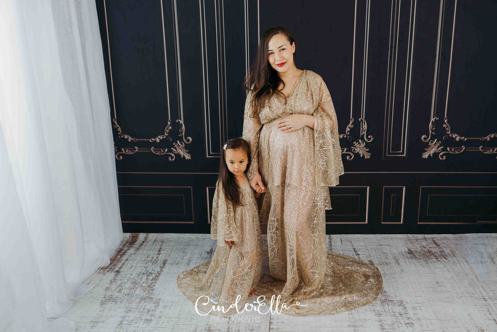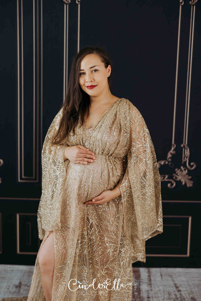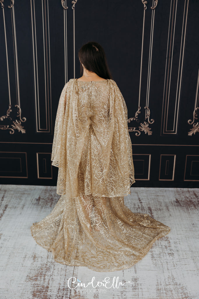Gold flutter sleeves gown. This wing/cape like gown has a cinch at the waist and a back zipper. Dress comes with a slip.